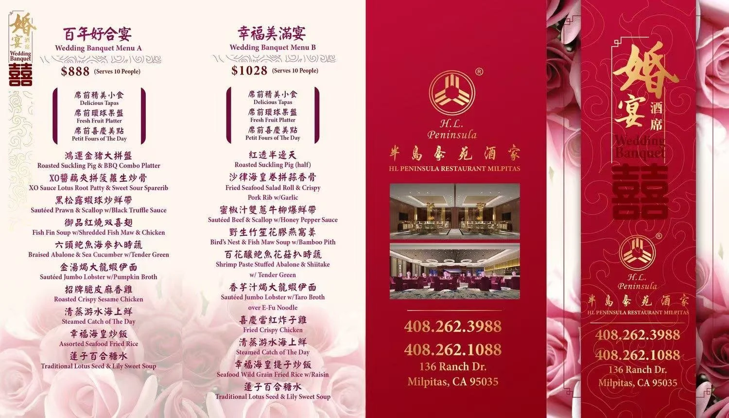 Wedding banquet menu from HL Peninsula Restaurant Milpitas, featuring options like delicious tapas, fresh fruit platter, pet fous of the day, roasted suckling pig and BBQ combo platter, XO sauce lotus root patty, sauteed prawn and black truffle sauce, fish fin soup, braised abalone with sea cucumber, sauteed jumbo lobster, assorted seafood fried rice, and traditional lotus seed and lily soup. The menu is in English and Chinese.