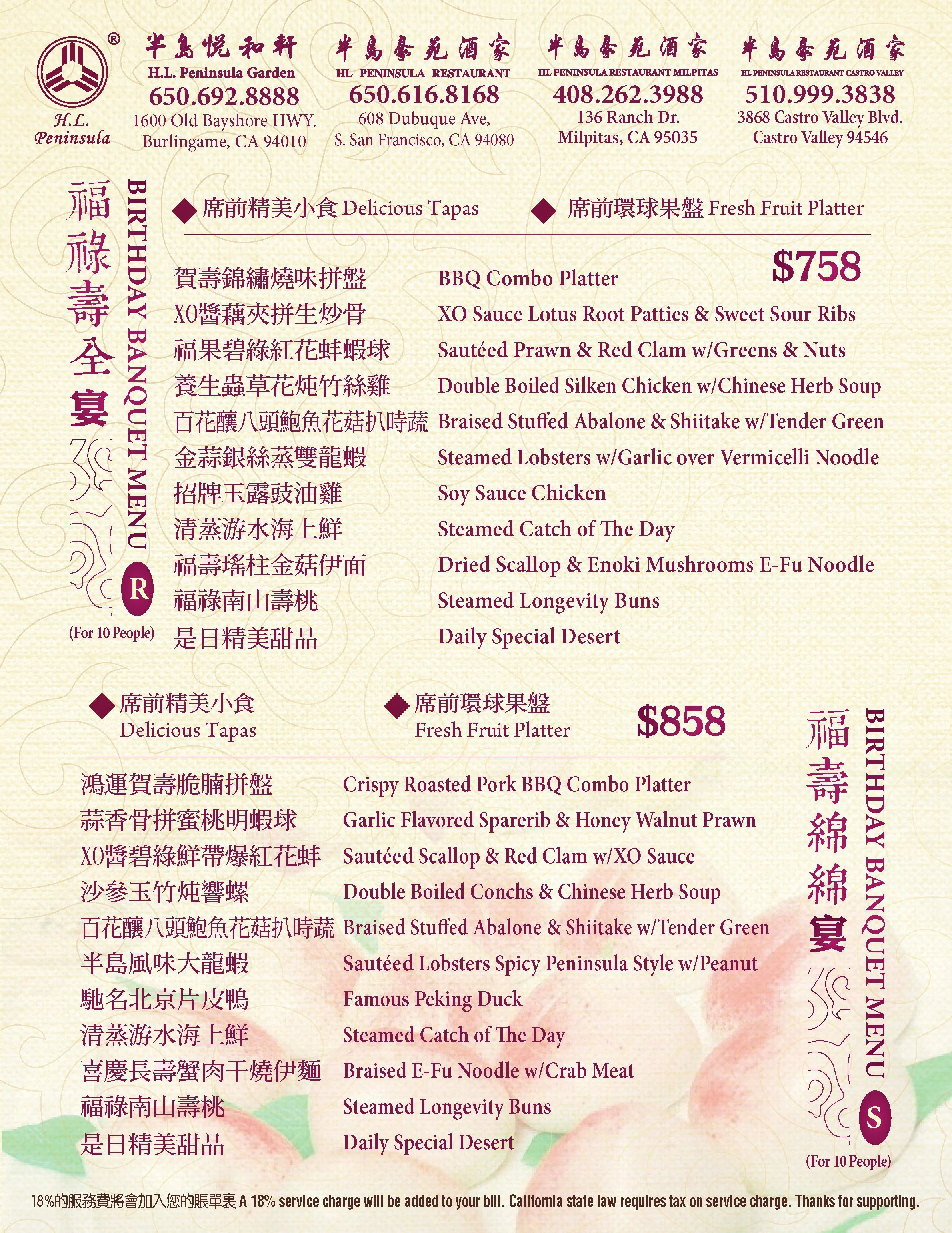 A menu for H.L. Peninsula Garden and Restaurant listing various dishes including fresh fruit platter, delicious tapas, BBQ combo platter, seafood dishes, and desserts, with contact numbers and addresses in California.